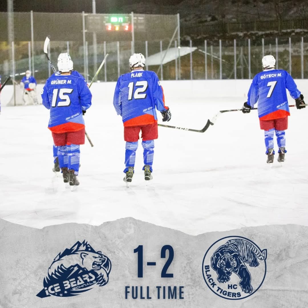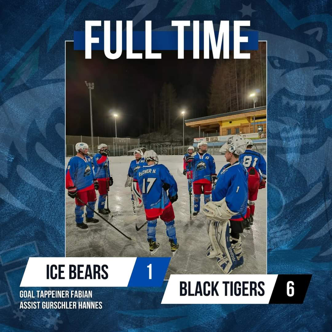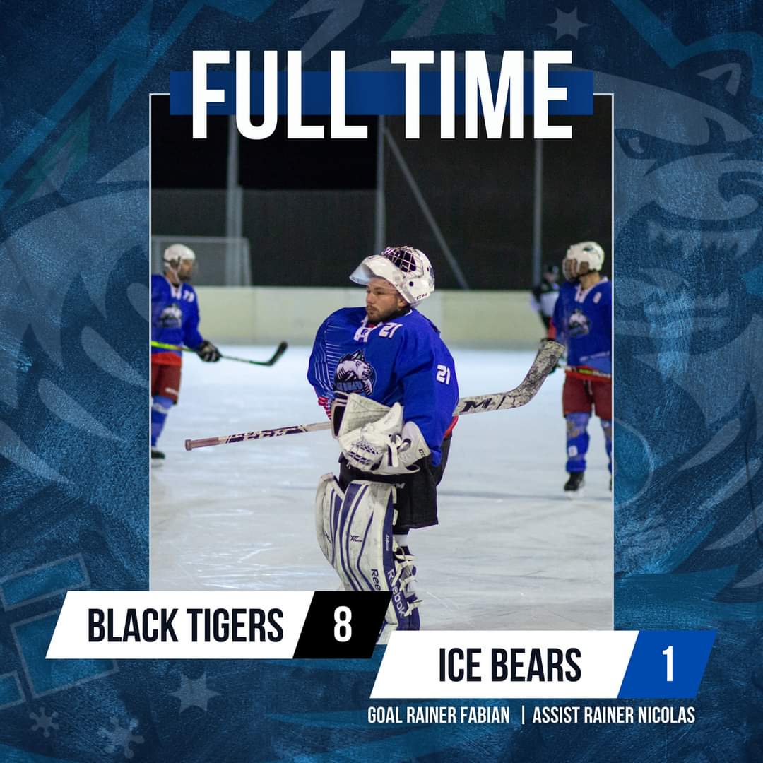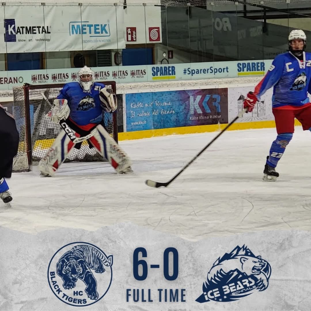 Am Freitag, 15.Dezember, gastierten die Titelfavoriten bei uns im Waldstadion Texel. Gleich zu Beginn der Partie war klar, dass unsere Jungs, die nur schwach besetzt waren, es schwer kriegen werden gegen den HC Black Tigers. In diesem Kader sind einige Ex Serie A und B Spieler aufzufinden.Die Gäste bauten von Anfang an enormen Druck auf und wir taten uns schwer aus der defensiven Zone herauszukommen. Nach dem ersten Tor der Gäste knickten wir ein und wir ließen zu viele Möglichkeiten zu. Somit ging’s mit einem 0:4 Rückstand zum ersten Pausentee. Im 2. Drittel kamen wir besser ins Spiel und erspielten uns die ein oder andere Chance heraus. Auch in der Defensive konnte man besser Dagegenhalten. Im Schlussabschnitt konnten wir durch viel Willenskraft und guten Zusammenspiel den Ehrentreffer erzielen. Fabian Tappeiner netze in Unterzahl auf Zuspiel von Hannes Gurschler zum 1:5 ein. Schließlich trennten sich die Mannschaften mit einem Endstand von 1:6 für die Gäste. Im Großen und Ganzen können wir mit unserer Leistung trotz Allem zufrieden sein. Bester Spieler bei den IceBears war wieder einmal unser starker Goalie Zambiasi Alexander der den Gegner mit Glanzparaden zum Haare raufen brachte.