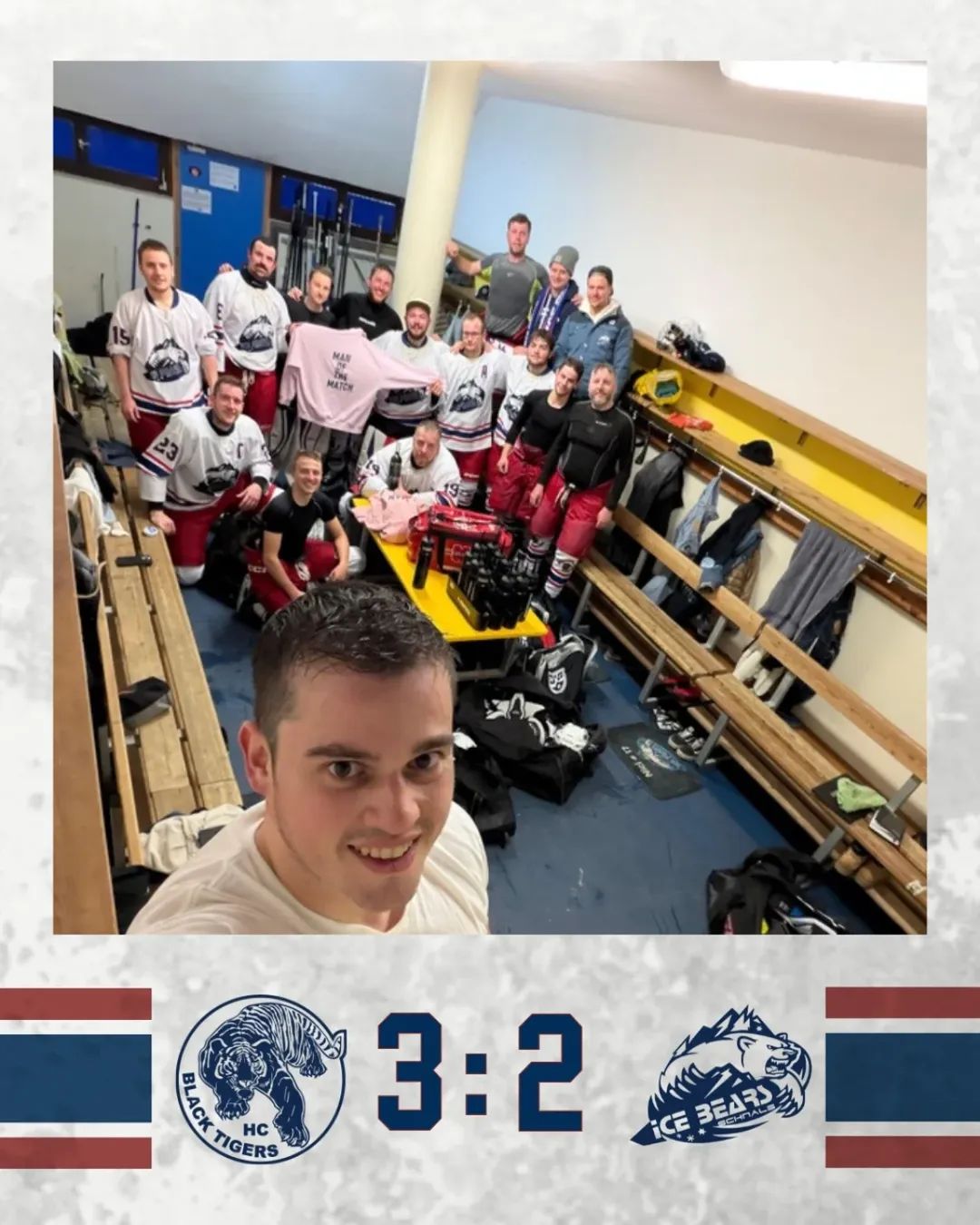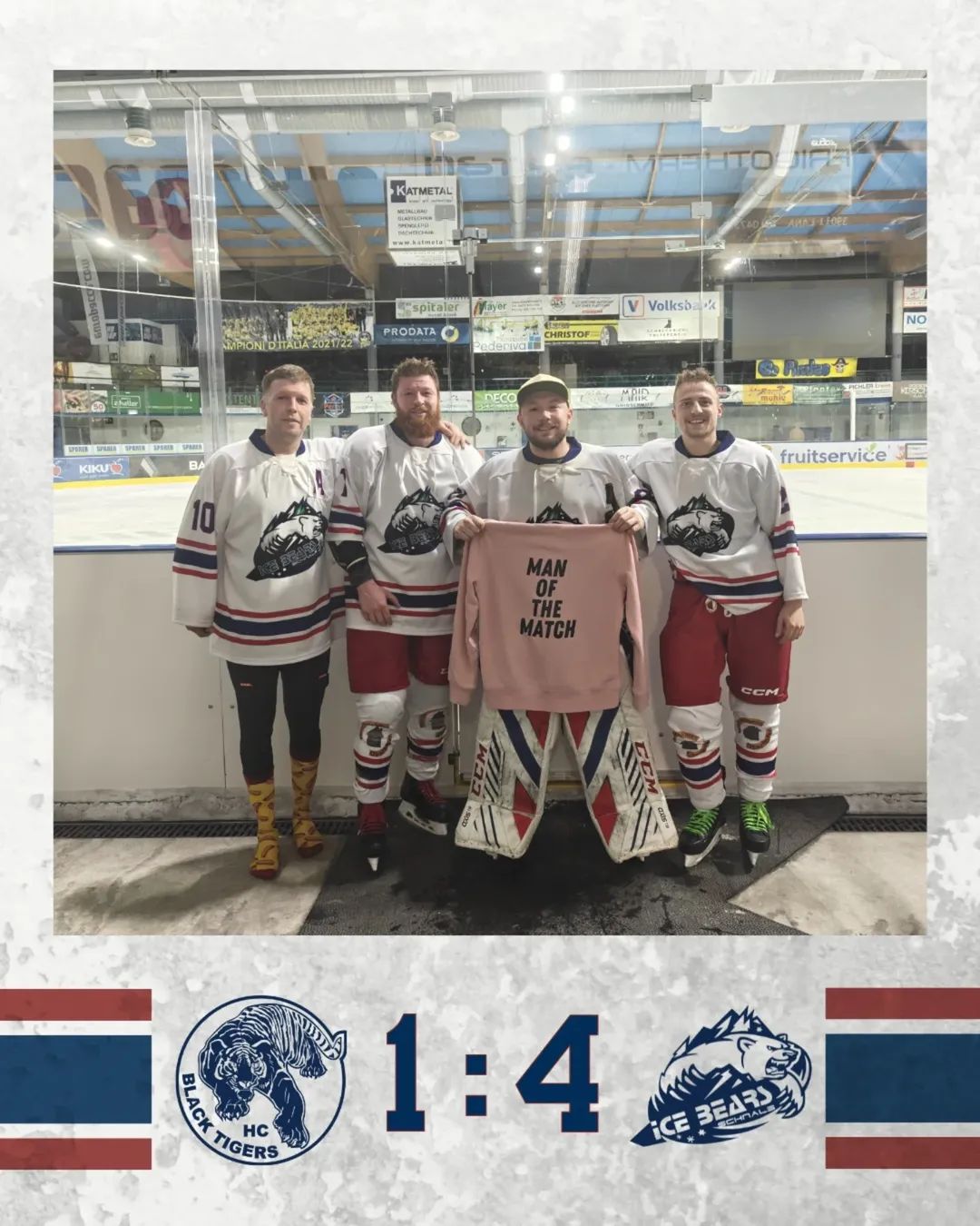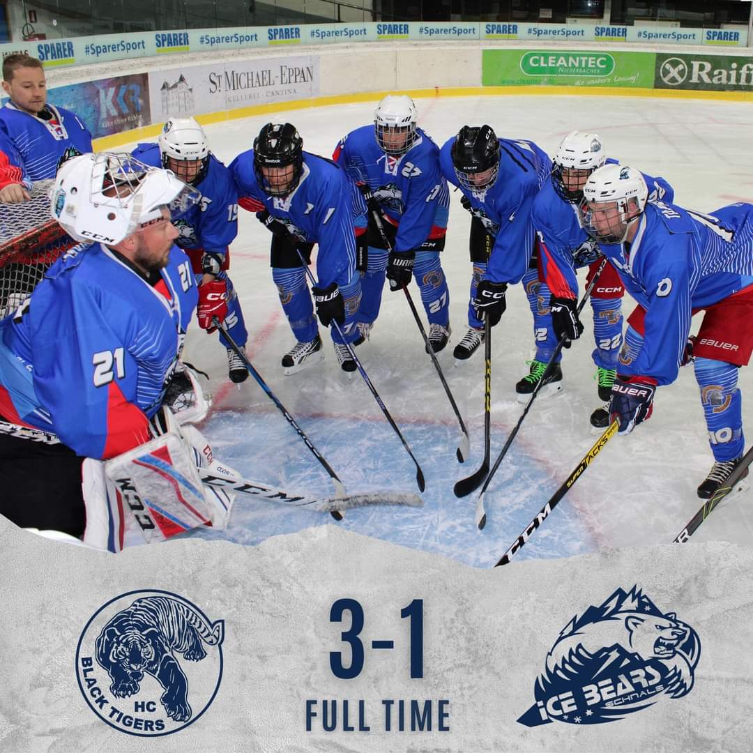 Am Freitag, 15.Dezember, gastierten die Titelfavoriten bei uns im Waldstadion Texel. Gleich zu Beginn der Partie war klar, dass unsere Jungs, die nur schwach besetzt waren, es schwer kriegen werden gegen den HC Black Tigers. In diesem Kader sind einige Ex Serie A und B Spieler aufzufinden.Die Gäste bauten von Anfang an enormen Druck auf und wir taten uns schwer aus der defensiven Zone herauszukommen. Nach dem ersten Tor der Gäste knickten wir ein und wir ließen zu viele Möglichkeiten zu. Somit ging’s mit einem 0:4 Rückstand zum ersten Pausentee. Im 2. Drittel kamen wir besser ins Spiel und erspielten uns die ein oder andere Chance heraus. Auch in der Defensive konnte man besser Dagegenhalten. Im Schlussabschnitt konnten wir durch viel Willenskraft und guten Zusammenspiel den Ehrentreffer erzielen. Fabian Tappeiner netze in Unterzahl auf Zuspiel von Hannes Gurschler zum 1:5 ein. Schließlich trennten sich die Mannschaften mit einem Endstand von 1:6 für die Gäste. Im Großen und Ganzen können wir mit unserer Leistung trotz Allem zufrieden sein. Bester Spieler bei den IceBears war wieder einmal unser starker Goalie Zambiasi Alexander der den Gegner mit Glanzparaden zum Haare raufen brachte.