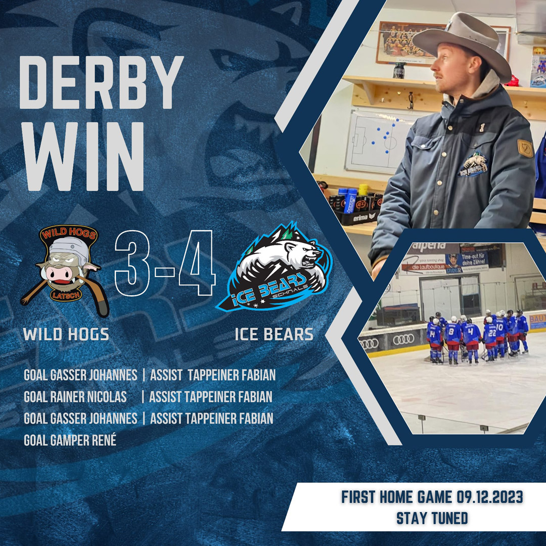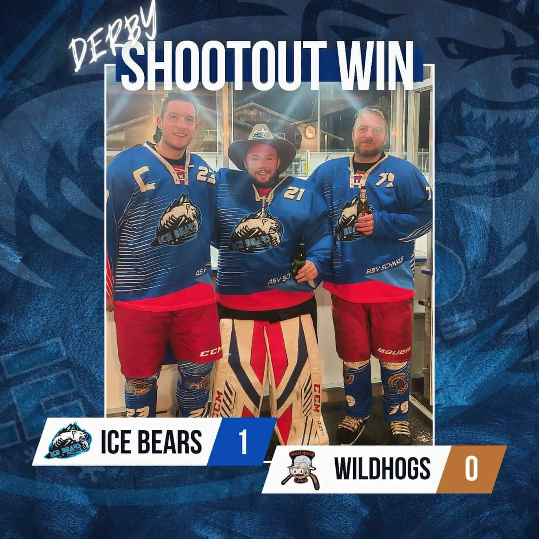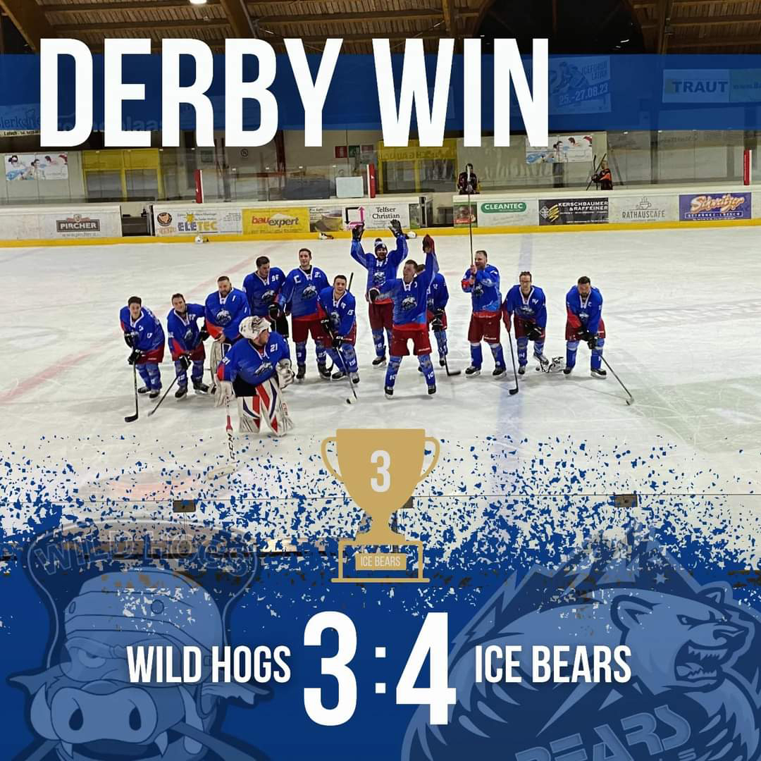 Doch die Wilhogs waren drauf und dran, auch das dritte Derby für sich zu entscheiden. Gleich nach dem Anpfiff gelang den Gästen das 0:1, doch nach diesem „Wachrüttler” gelang es uns, gut ins Spiel zu kommen, und wir kamen zu guten Möglichkeiten. Im zweiten Drittel gelang es uns schließlich, mit Hilfe von Manuel Götsch den Ausgleich zu erzielen. Das mit Strafen durchwachsene Spiel ging mit einem 1:1 in die Endphase. Zehn Minuten vor Schluss gelang es Traunig Lukas, auf 2:1 zu erhöhen. Zambiasi ließ keinen weiteren Treffer zu und die WildHogs bissen sich die Zähne aus. Mit dem Tor von Christian „The Man” Weithaler bauten wir die Führung aus und schaukelten das Ding sicher nach Hause. Schließlich machte Johannes Gasser mit einem Empty-Net-Goal den Deckel drauf.