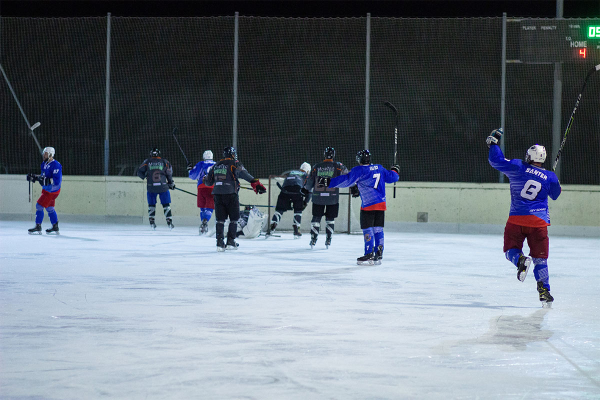 Im dritten Drittel versuchten wir uns wieder zu fokusieren und anzugreifen. Dies hatte zur Folge das man im defensiven Bereich nachlässig wurde und die Gegner bauten ihre Führung aus. 2 Minuten vor dem Schluss gelang es schliesslich unserem Capitän den Anschlusstreffer zu erziehlen. Nun setzte unsere Mannschaft alles auf eine Karte und nach einem entschärften Angriff des Gegners, verließ Zambiasi seinen Kasten um für einen sechsten Mann Platz zu machen. Wir setzten uns im Angriffsdrittel fest und 30 Sekunden vor Schluss zappelte der Puck im Netz. Torschütze zum Ausgleich war erneut unser Capitano Gamper René. Somit stand es nach der regulären Spielzeit 3:3 und die Kontrahenten mussten im Penaltyschiessen einen Sieger finden. Tappeiner Fabian bezwang den Schlussmann des HC Schlappis und Zambiasi lies keinen Treffer mehr zu.